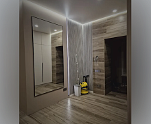 - эффектный 3D-эффект с текстурой под дерево, создает объем и глубину в помещении