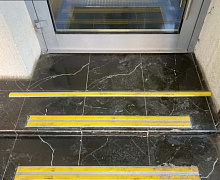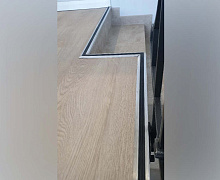 Способ монтажа: алюминиевый порожек без вставки крепится в проем между двумя напольными покрытиями или на ступени при помощи саморезов (идут в комплекте). Затем прорезиненную ПВХ вставку нужно нагреть строительным или обычным феном, либо подержать в горячей воде, чтобы материал стал мягче и легче вошел в паз профиля.